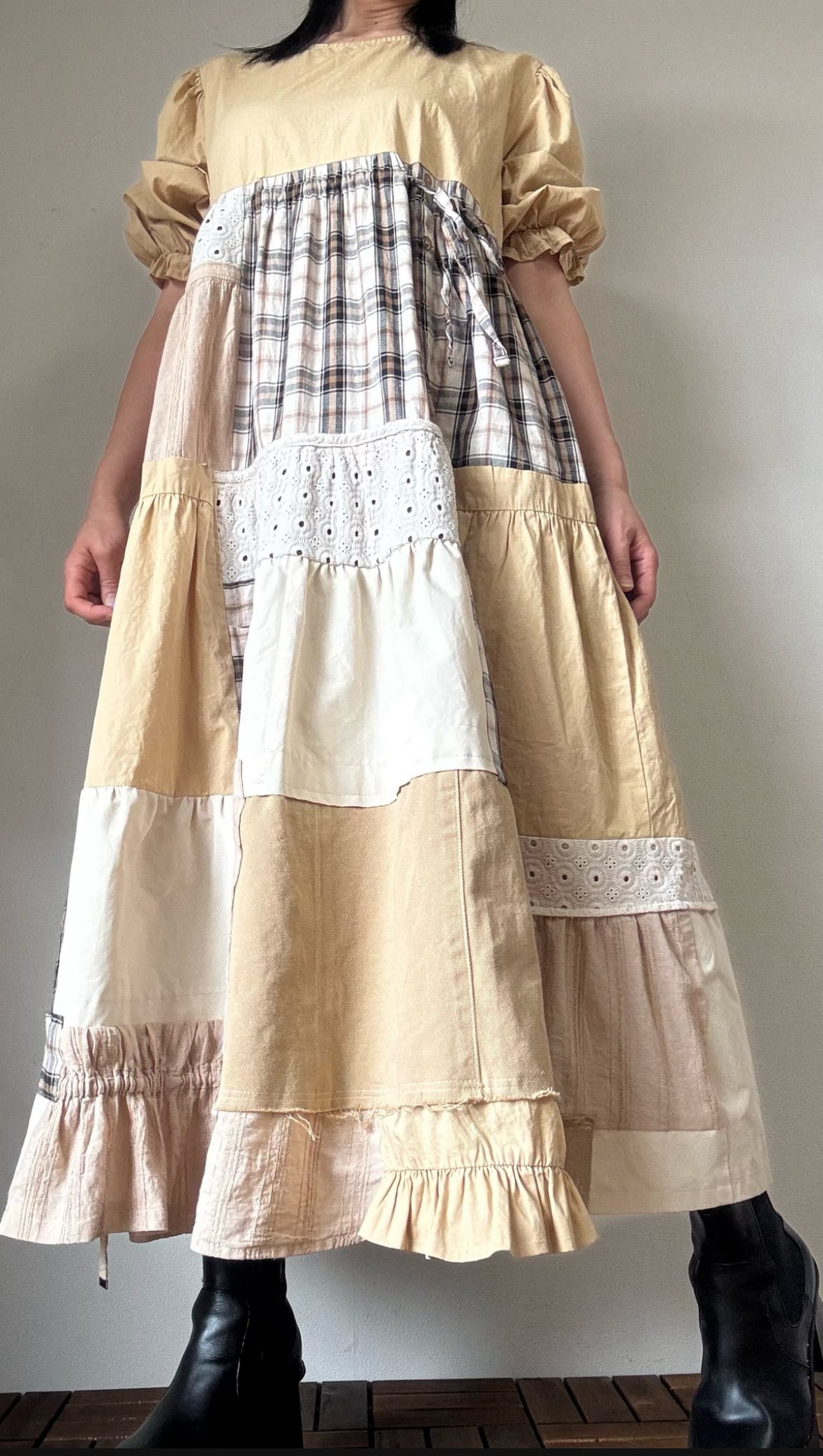 異素材と柄を丁寧に組み合わせた、ナチュラルカラーのリメイクワンピース。