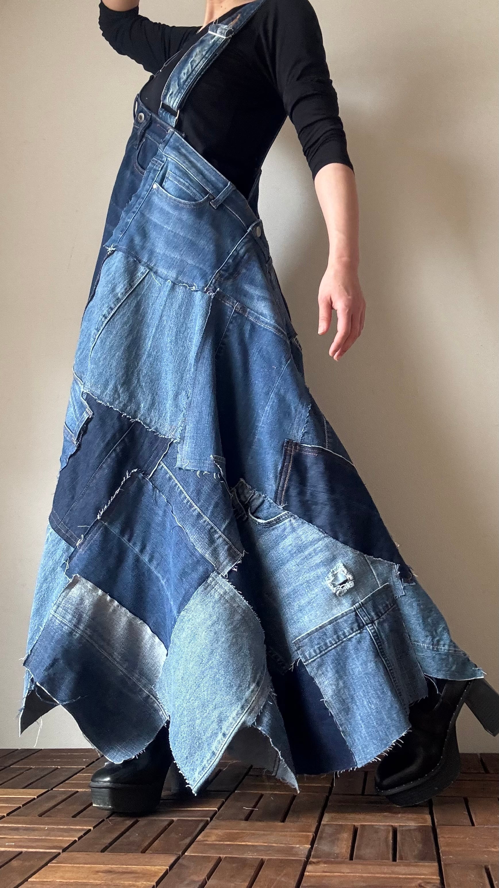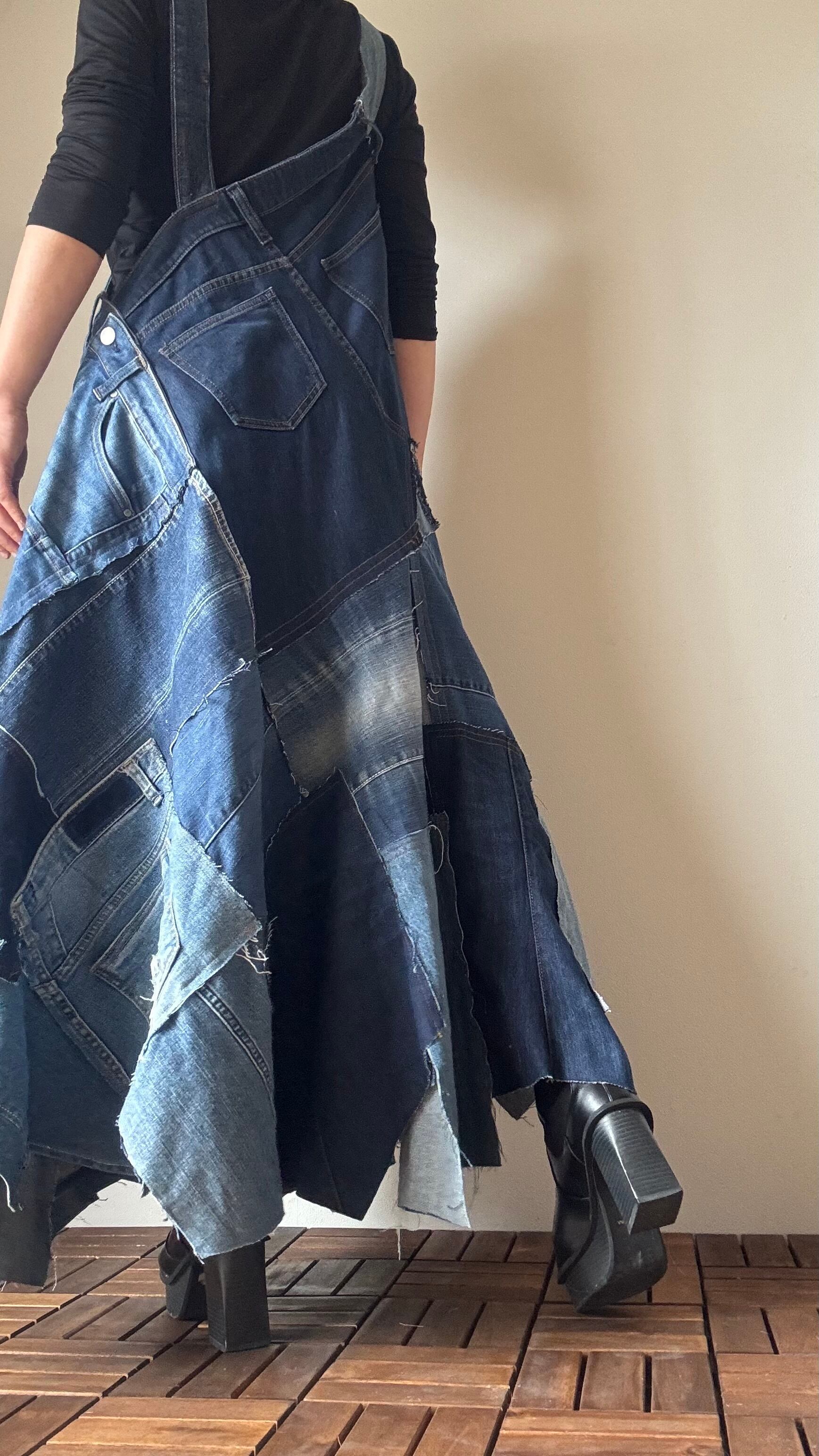 古着ジーンズを丁寧に継ぎ合わせ、ドラマチックなフレアに仕立てました。