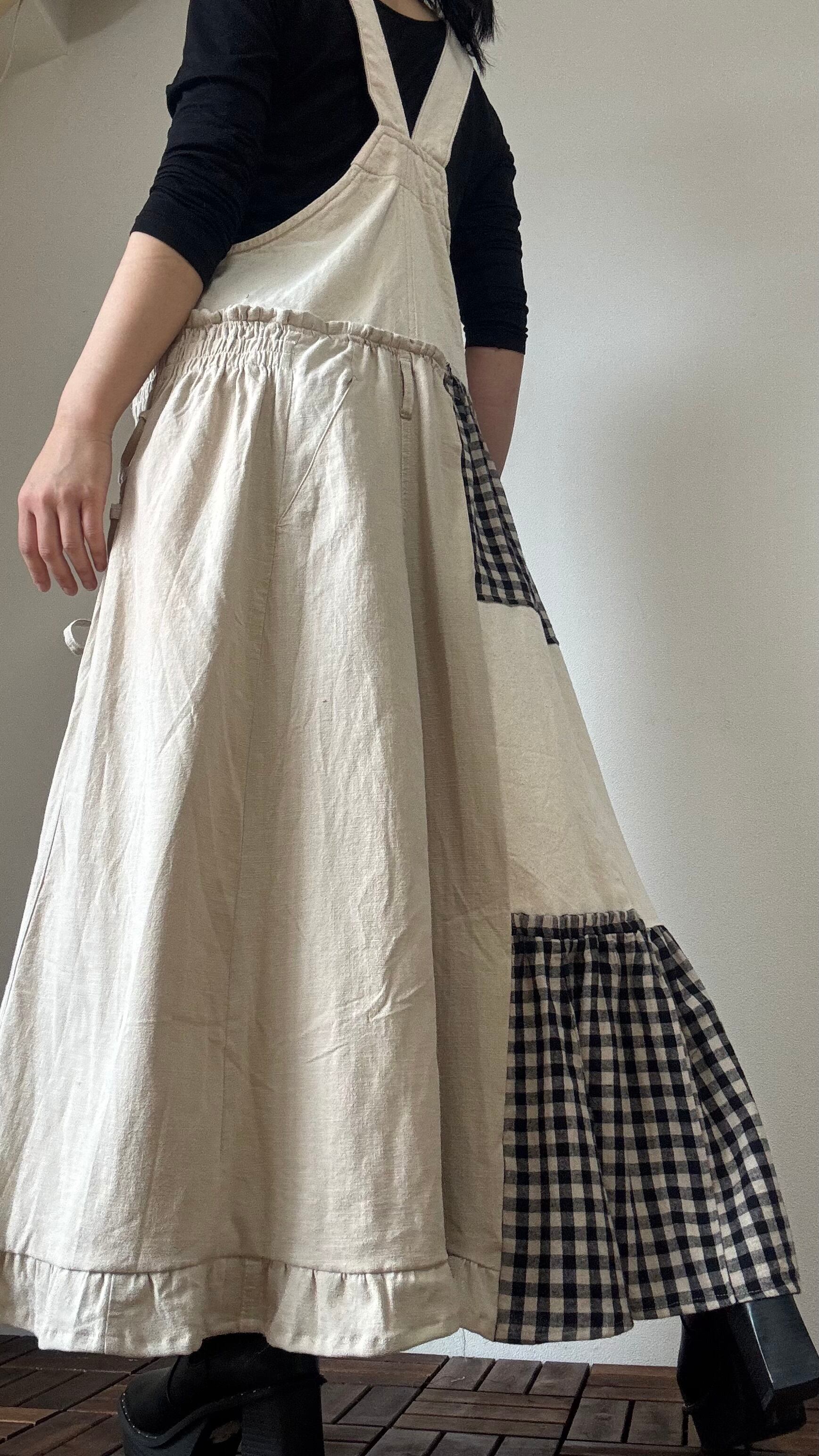 ナチュラルな風合いにブロックチェックを効かせた、古着リメイクのジャンパースカート
