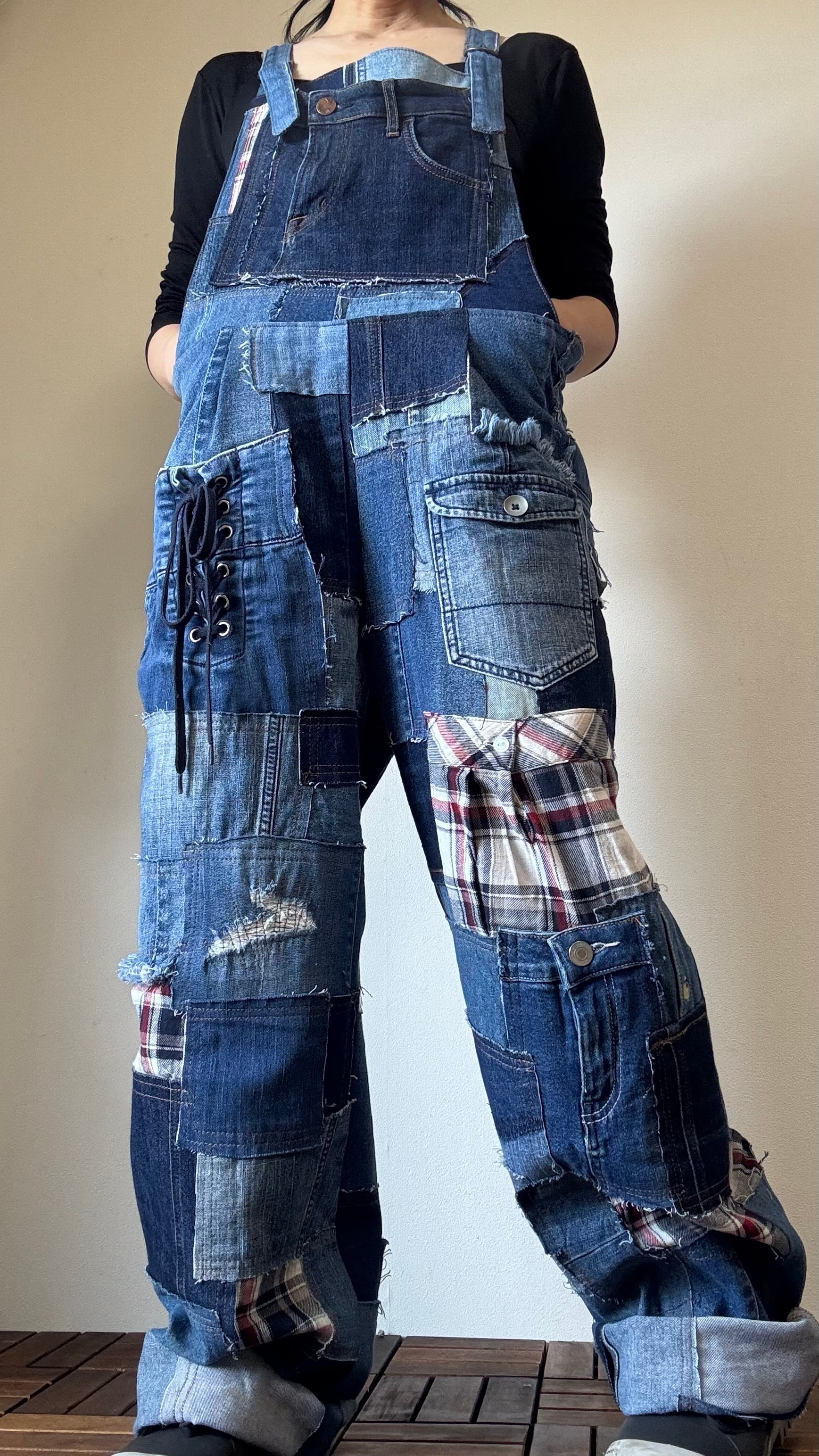 チェック柄シャツの襟が目を引く、存在感たっぷりのリメイクデニムオーバーオール。