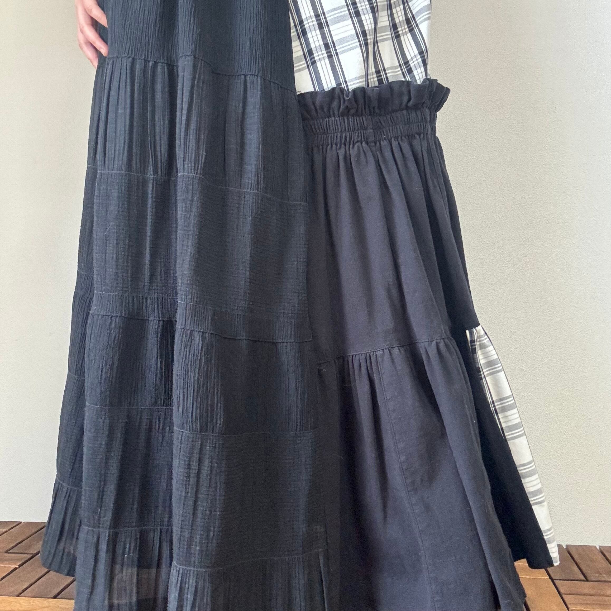 モノトーンの異素材をパッチワークで組み合わせた、存在感あるリメイクスカート。