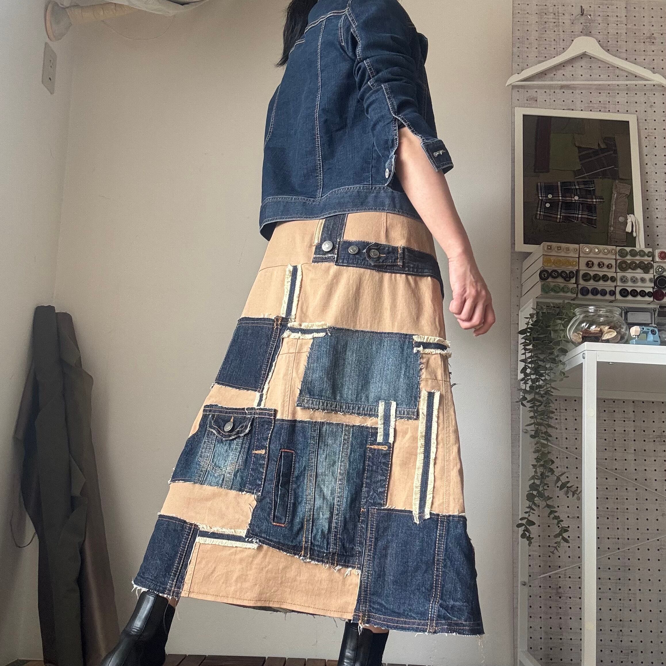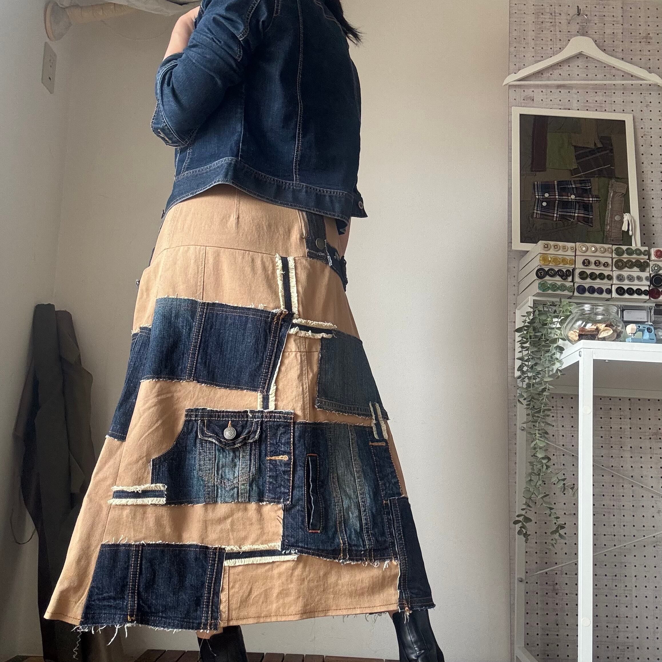 スカート 綿(ベージュ地)、古着デニム(綿100%)