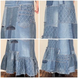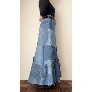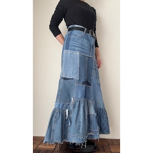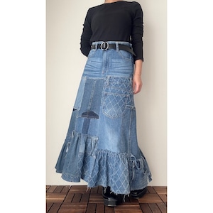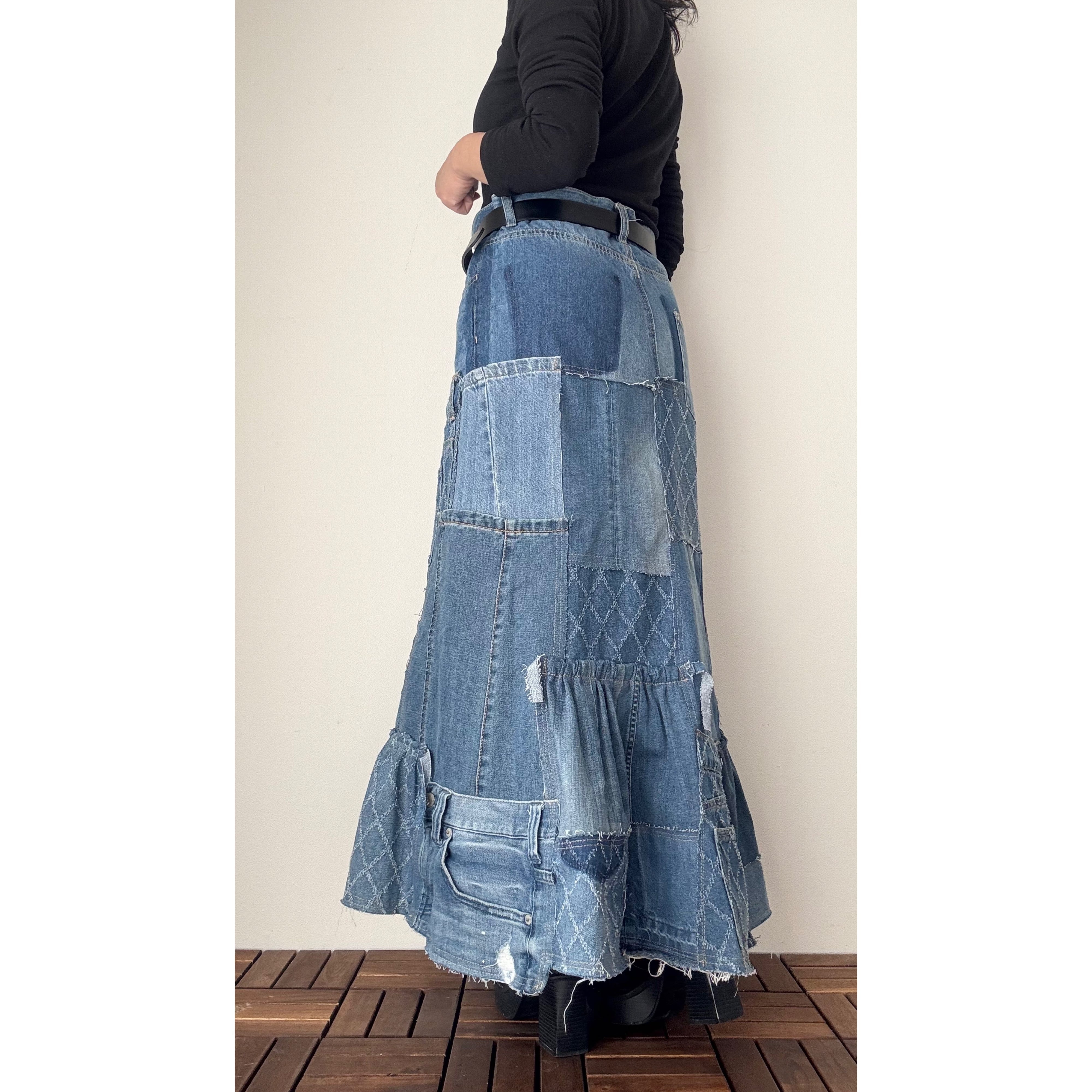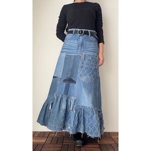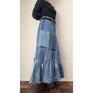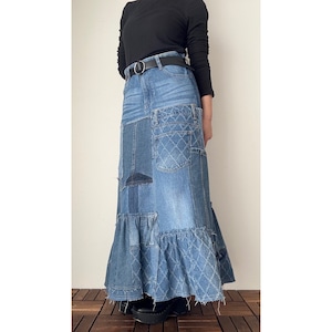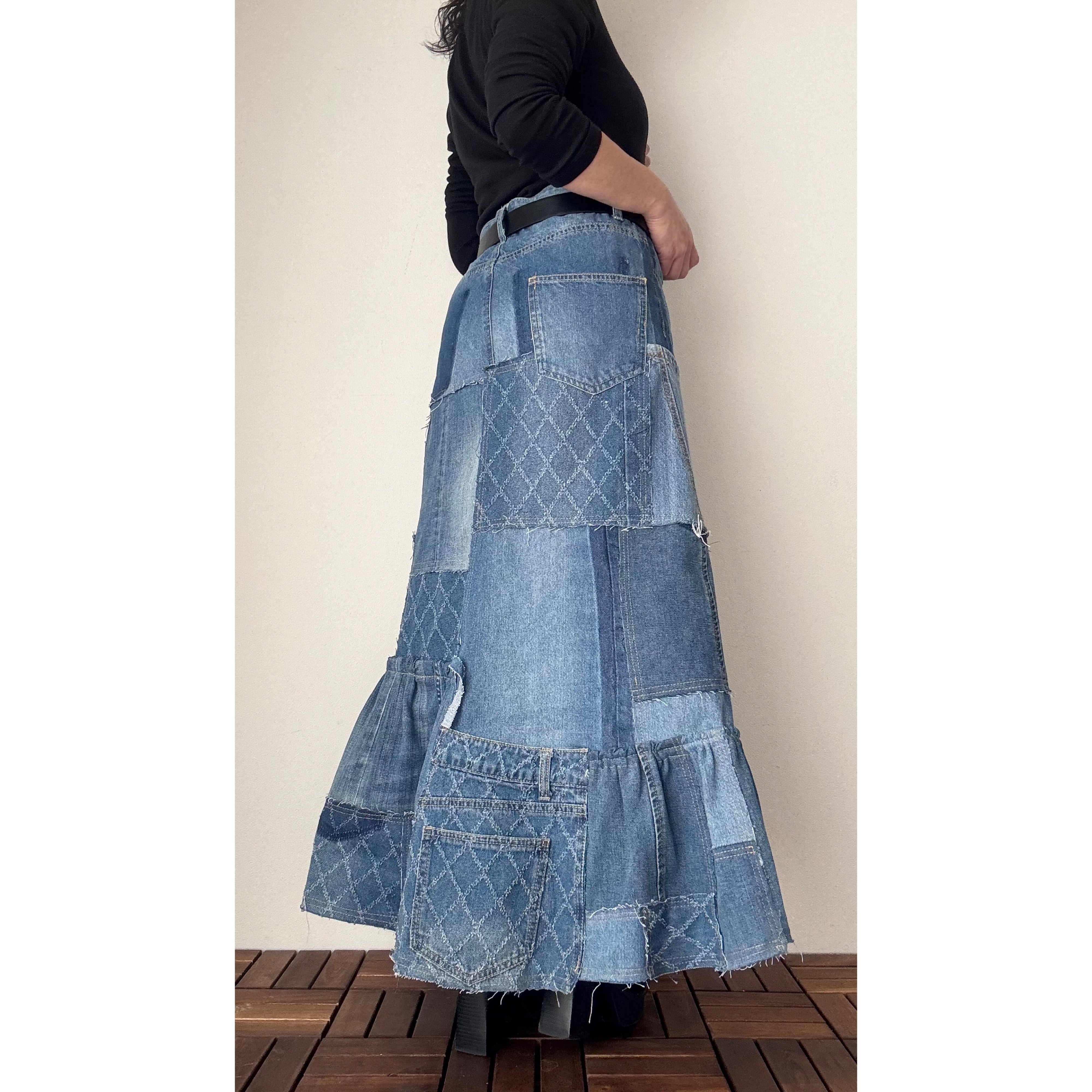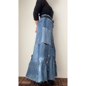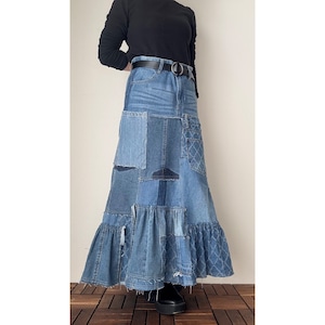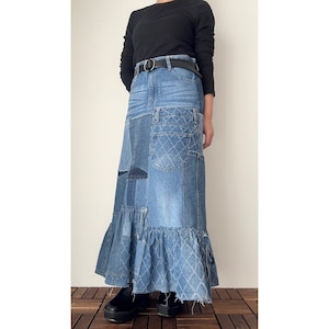 数種類の古着デニムを組み合わせ、落ち着いたブルー系でまとめたパッチワークロングスカートです。