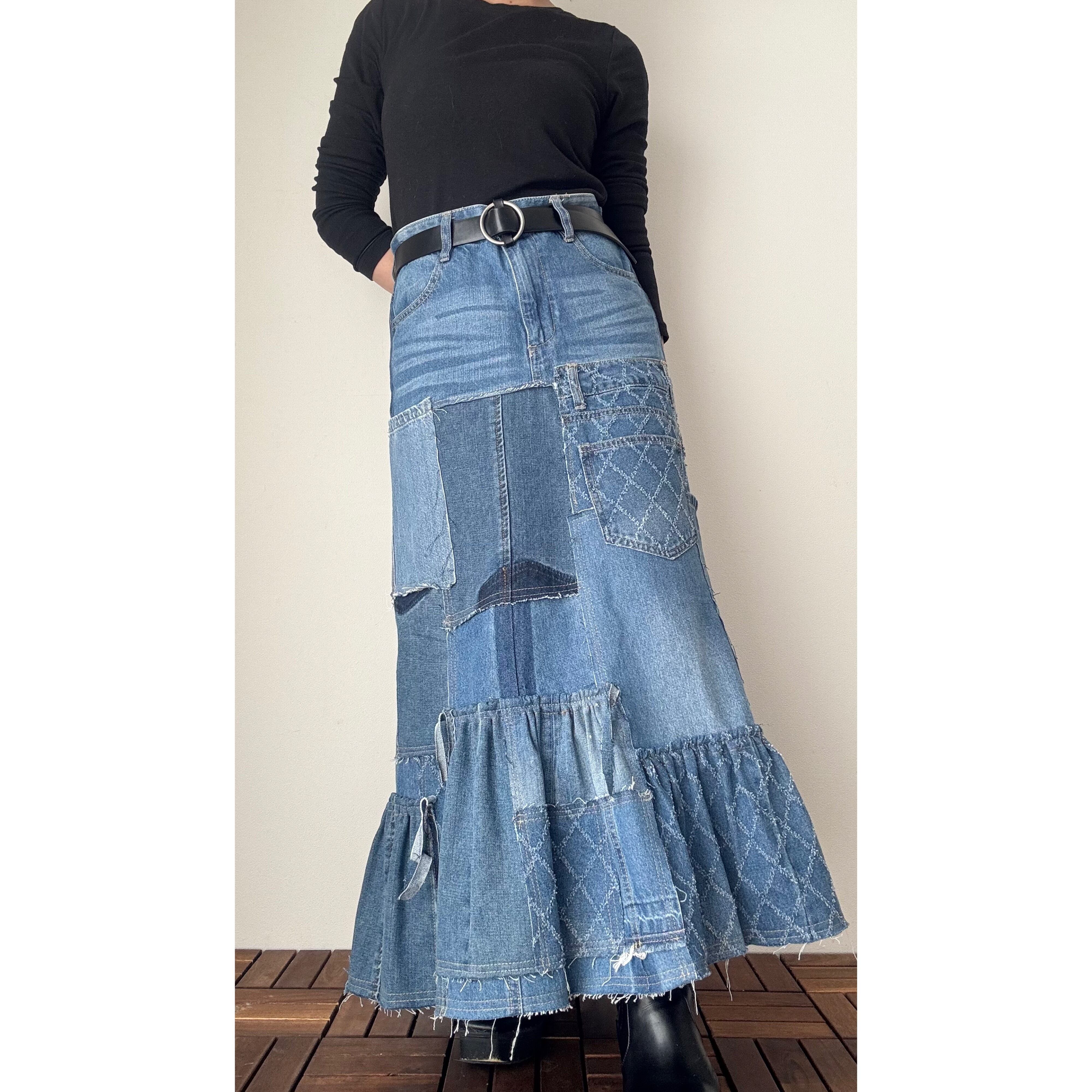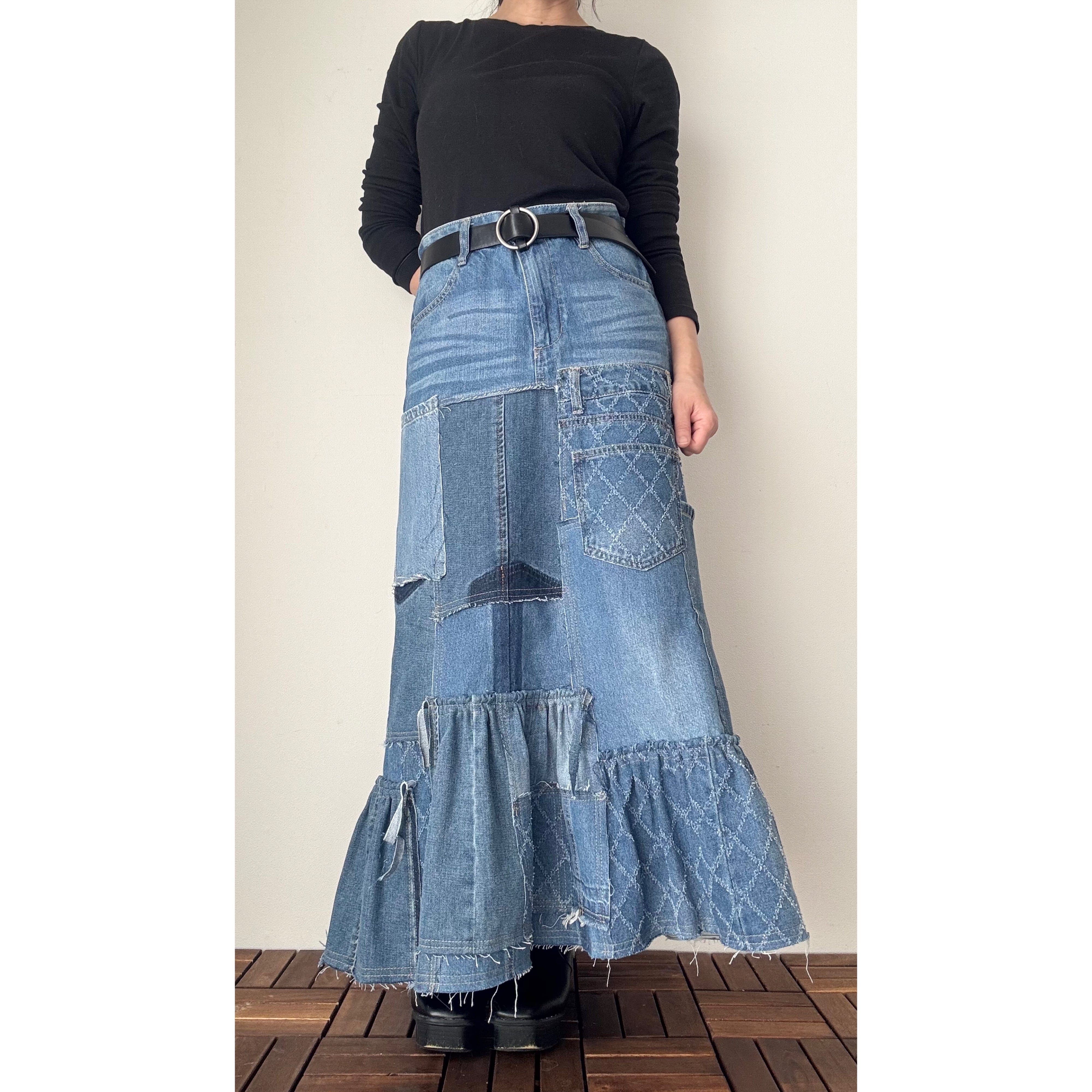 落ち着いたブルーの古着デニムで作るパッチワークロングスカート|古着リメイクアップサイクル一点もの デニムリメイク リメイクデニム