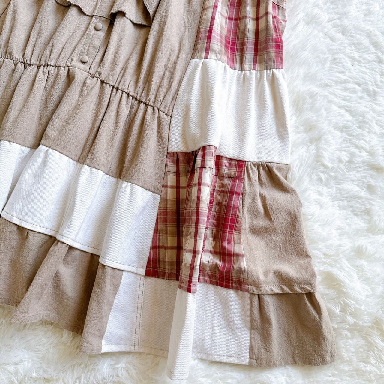 コットンオーバーオール×コットンチェック柄シャツ×グレージュフリルワンピの特徴を生かし、バランス良く組み合わせて個性的なジャンパースカートに仕立てました。