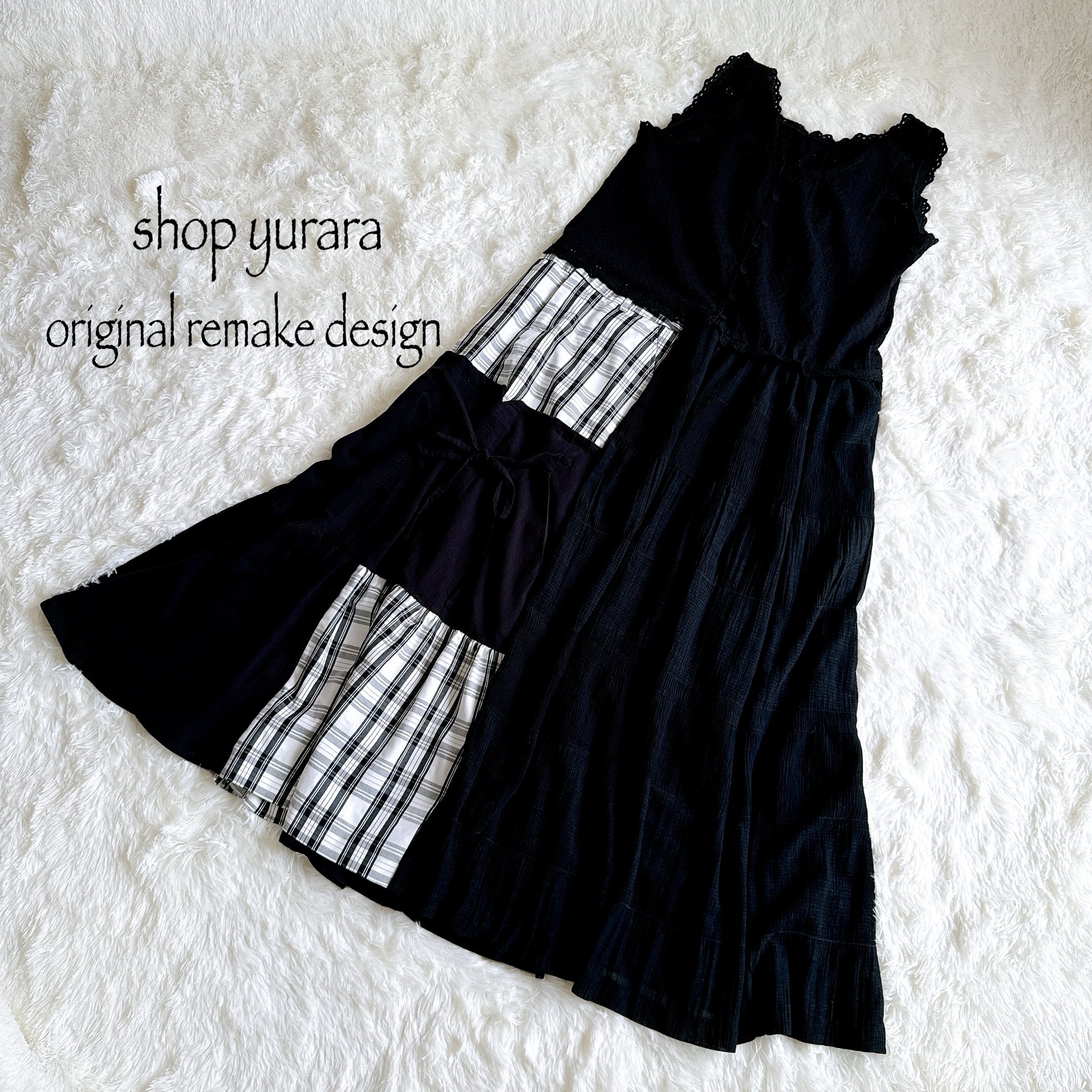ハンドメイドの1点物、usedリメイクの個性的なワンピースです。