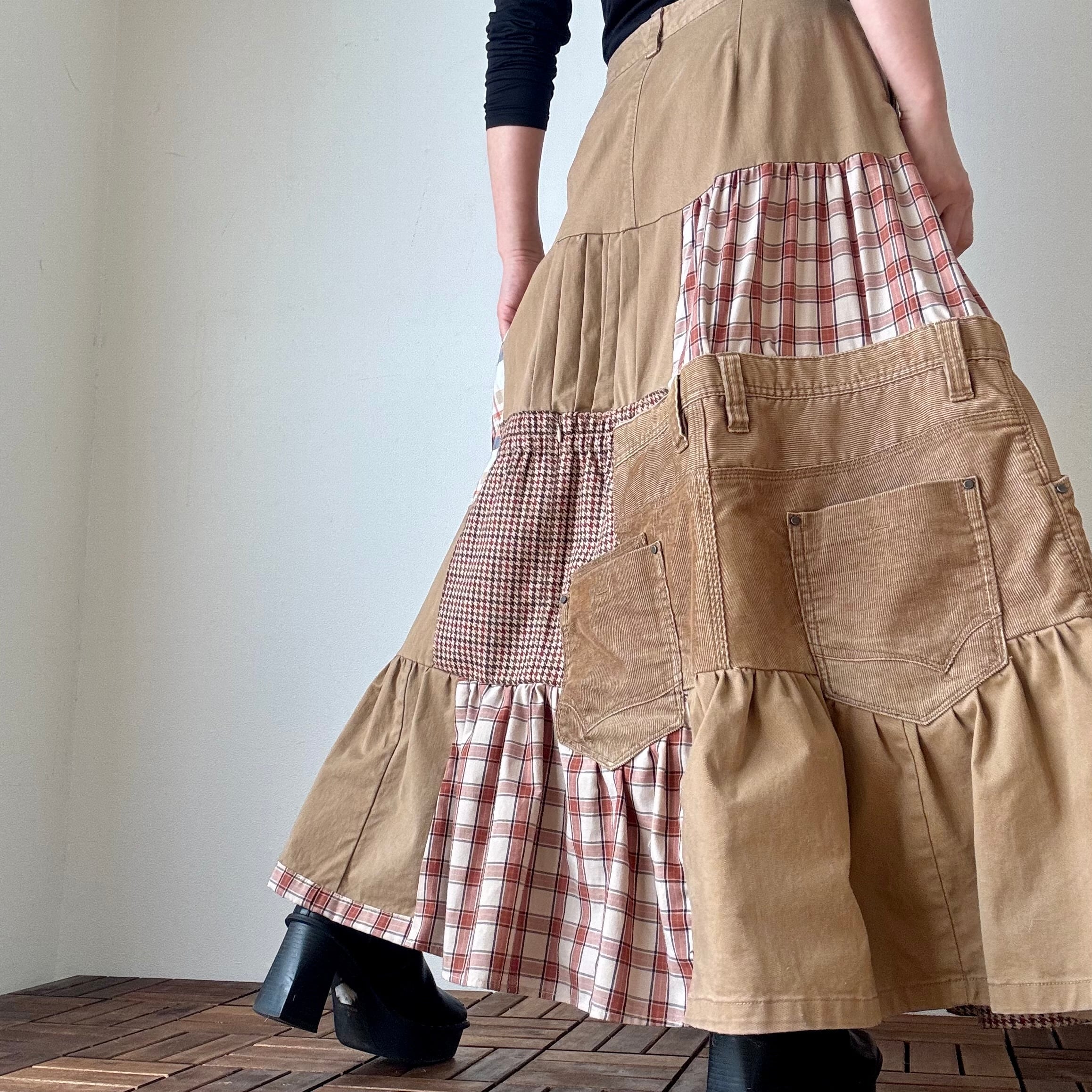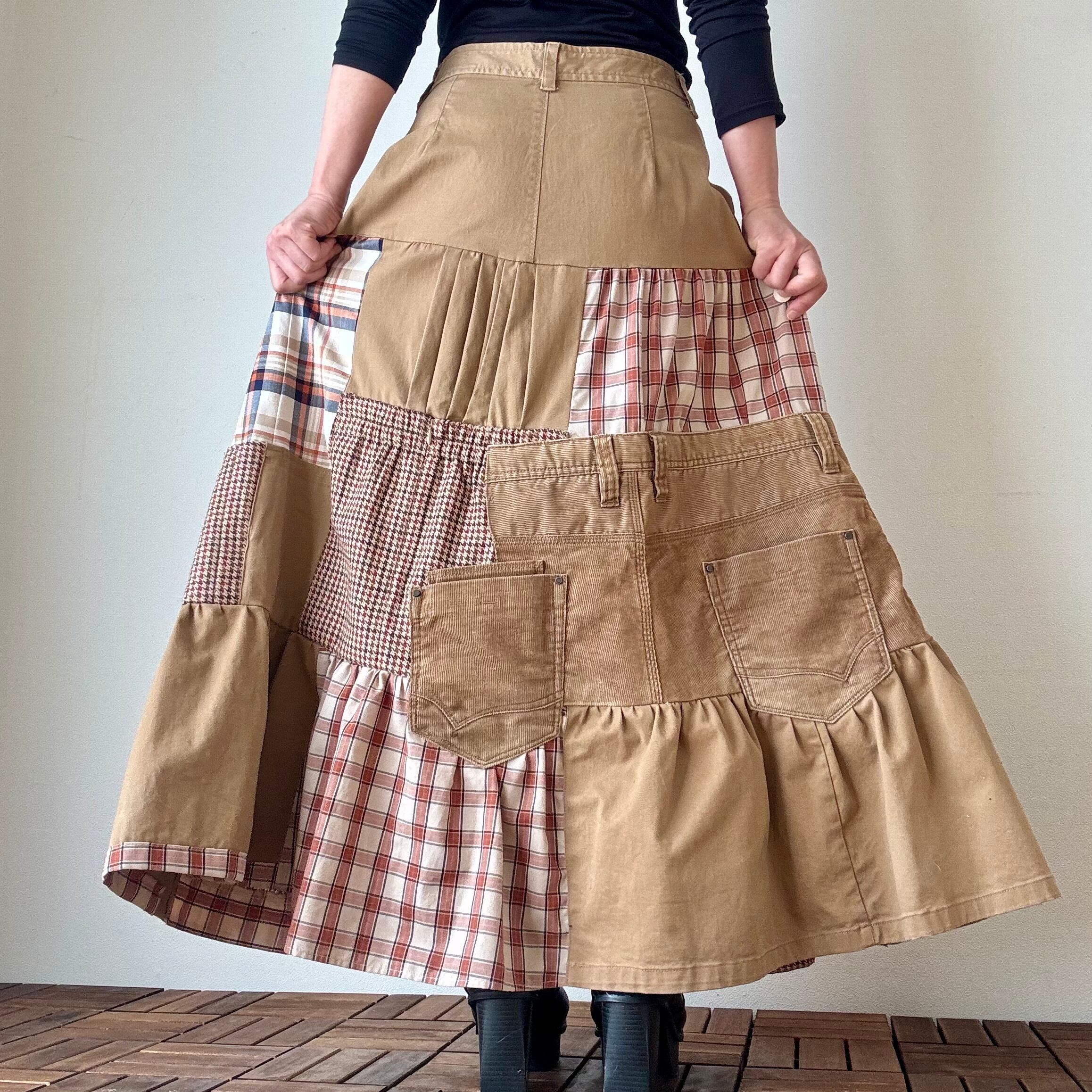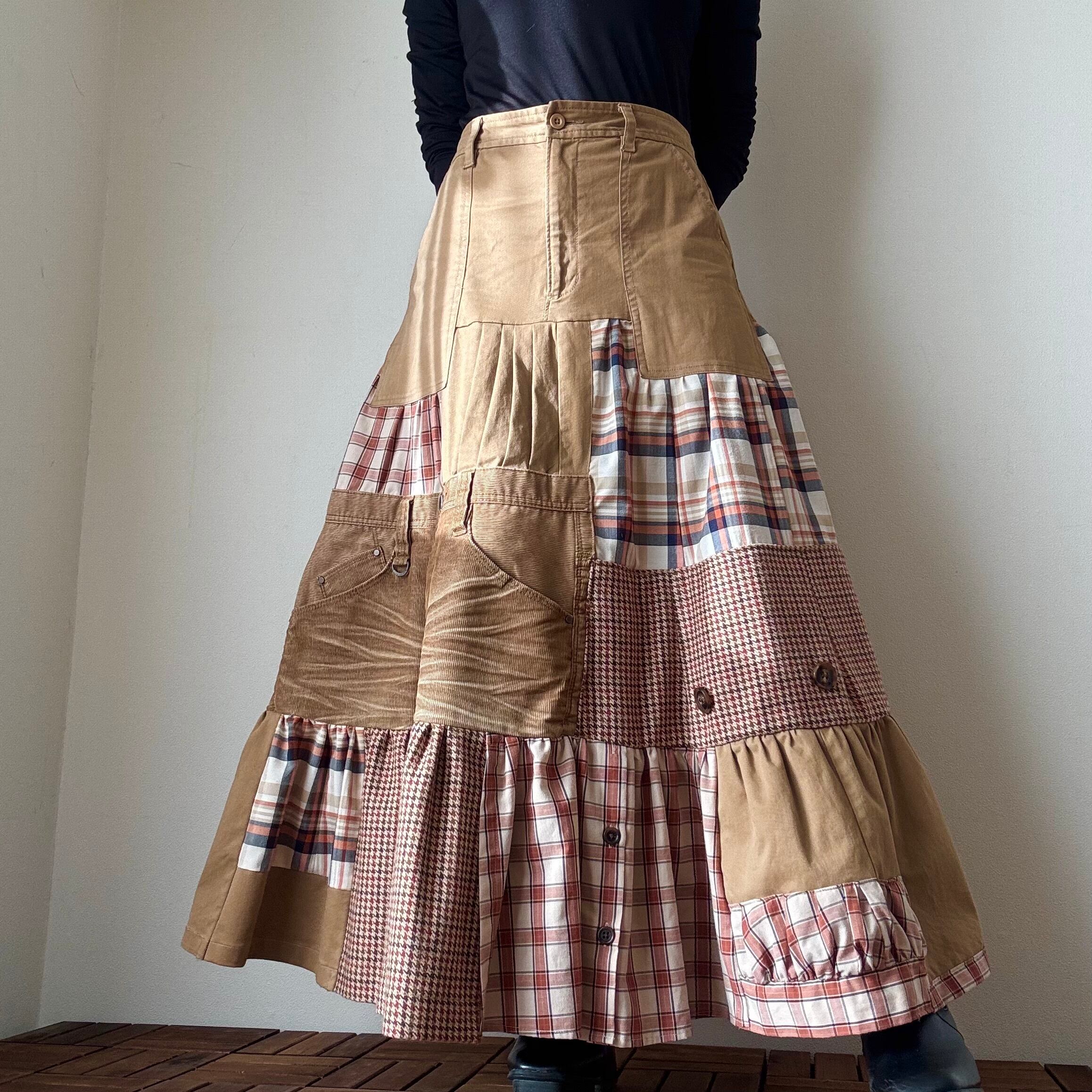 ブラウンを基調とした、色々なチェック柄の生地を組み合わせたusedリメイクのロングスカートです。