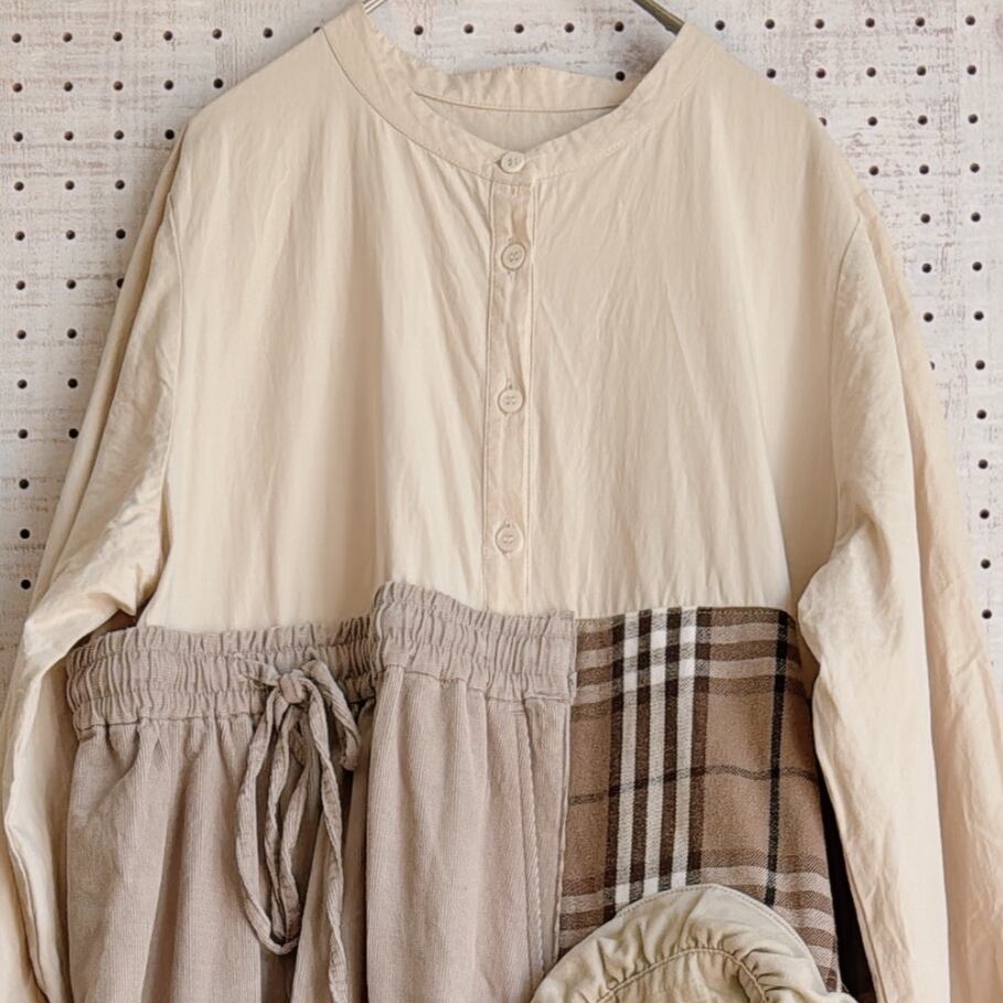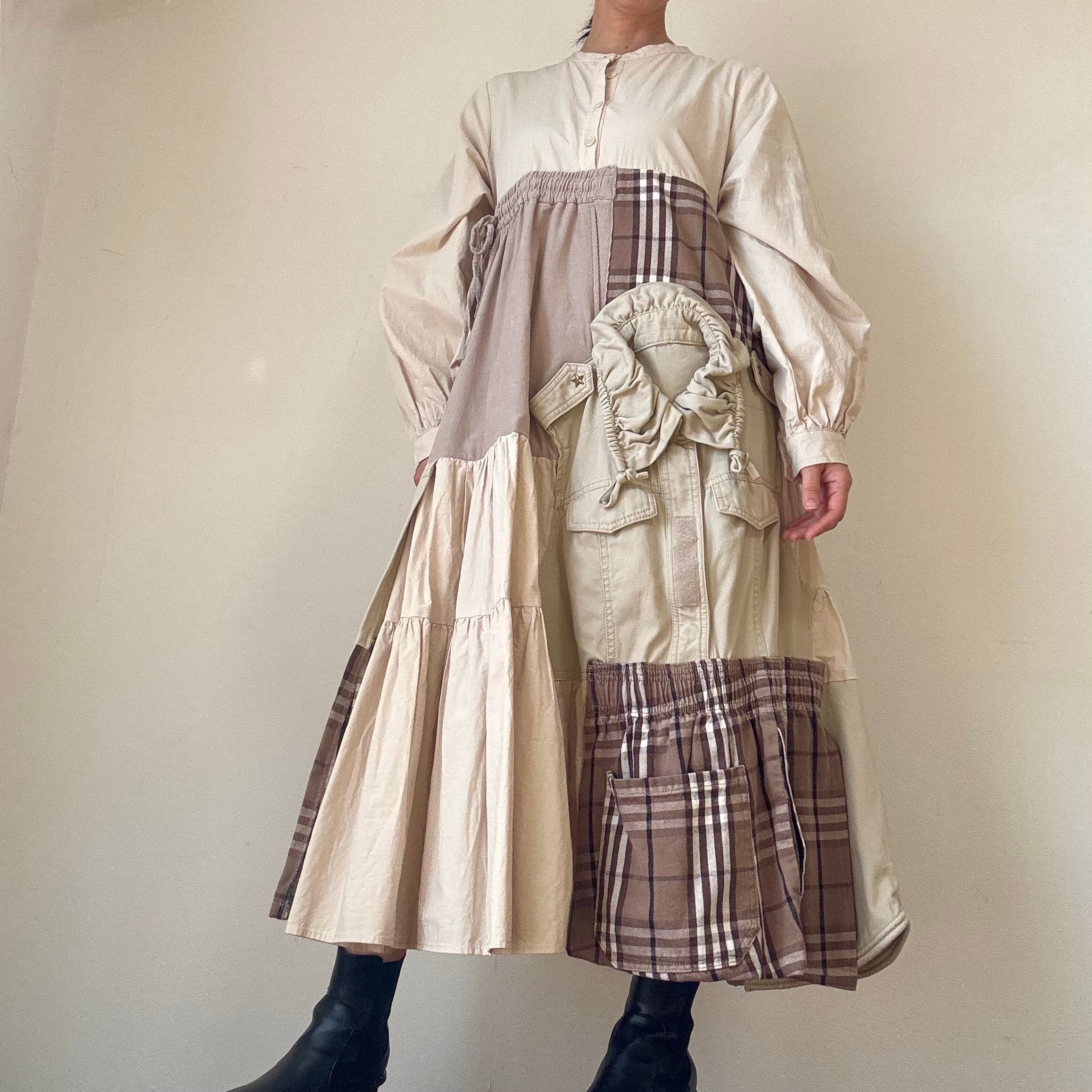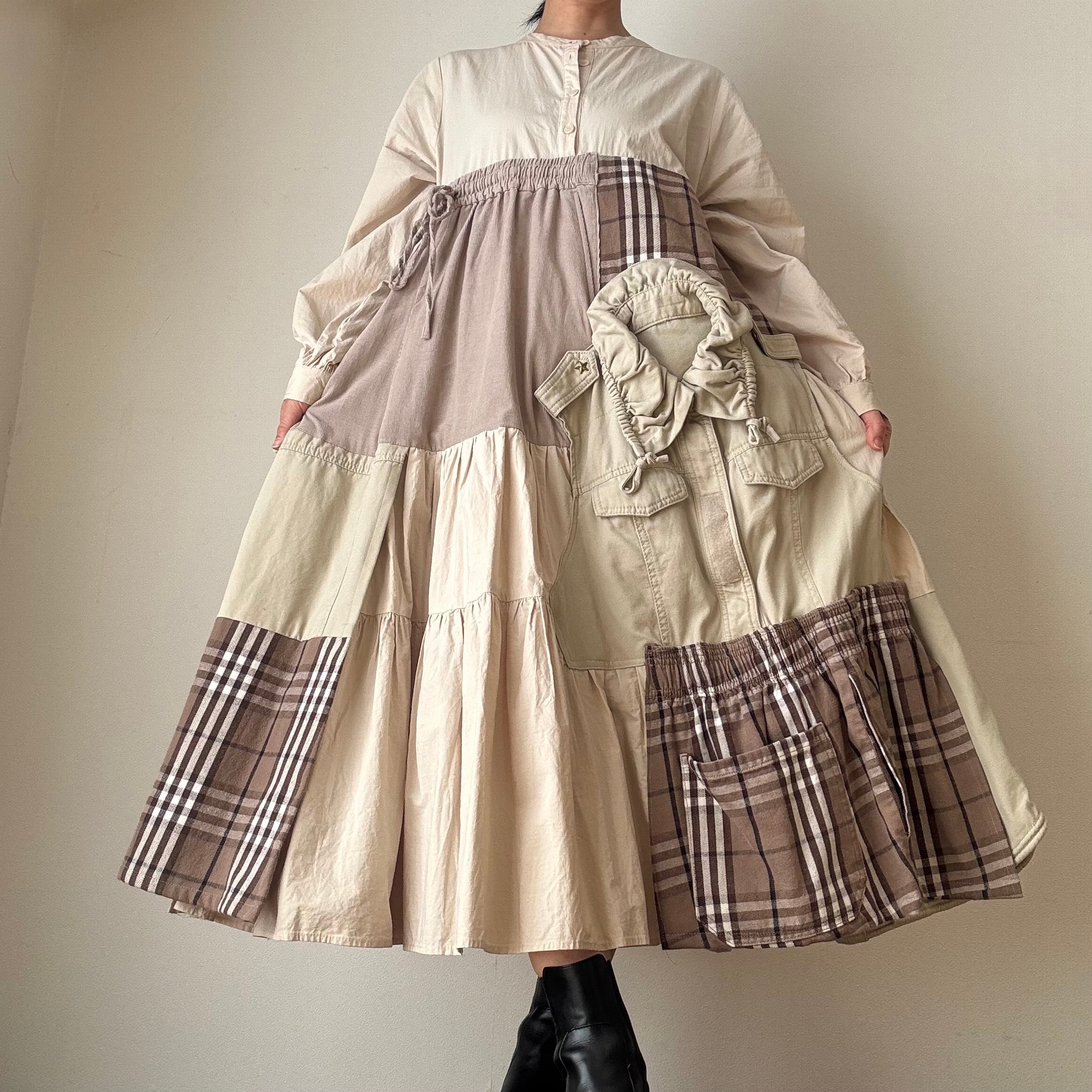 ベージュカラーを基調とした、チェック柄パンツなどを組み合わせたusedリメイクのロングシャツワンピース。