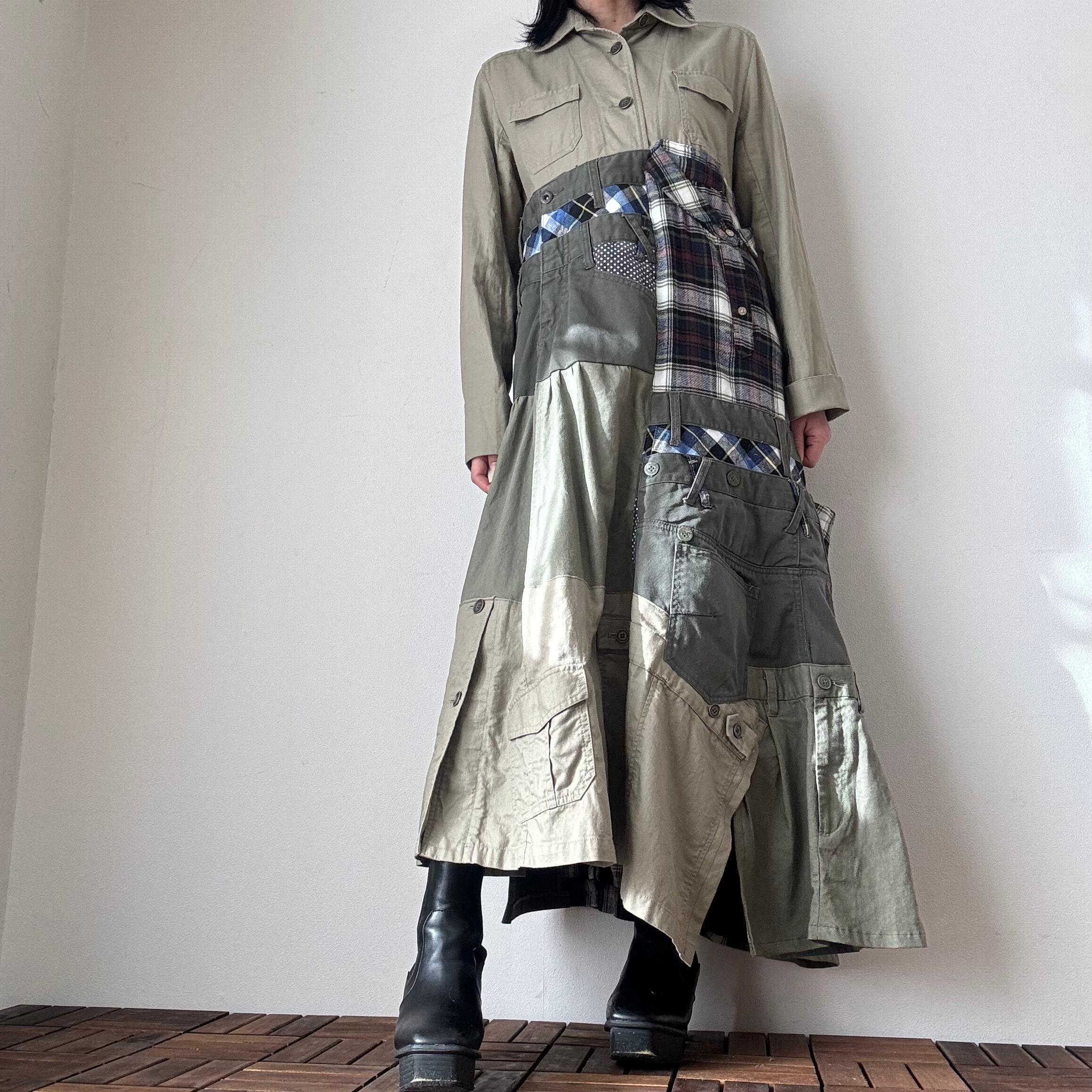 011 usedリメイクチェック柄シャツワンピース ミリタリー カーキ