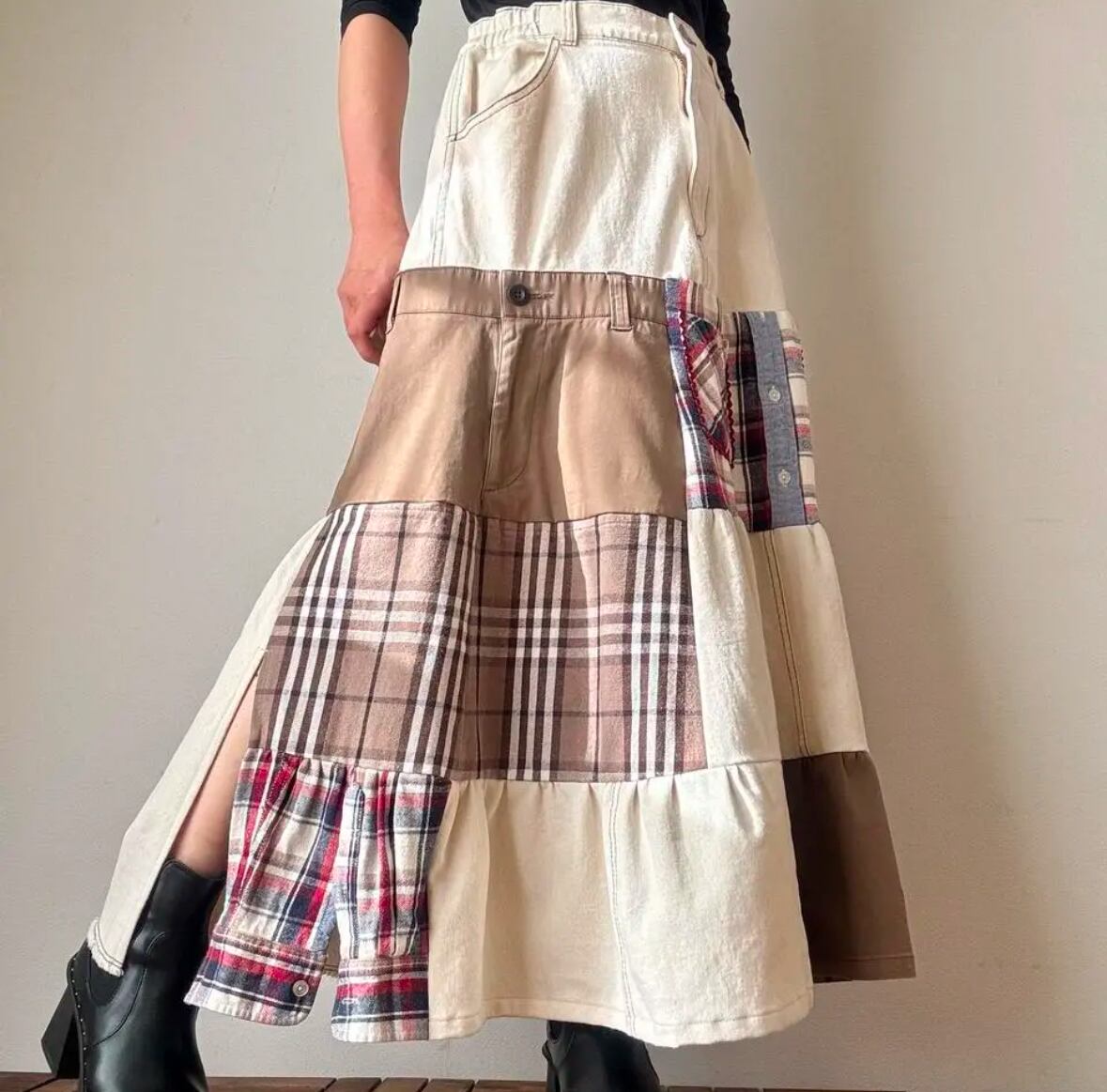 No.012 usedリメイクチェック柄スカート 一点もの パッチワーク チェック柄 古着リメイク